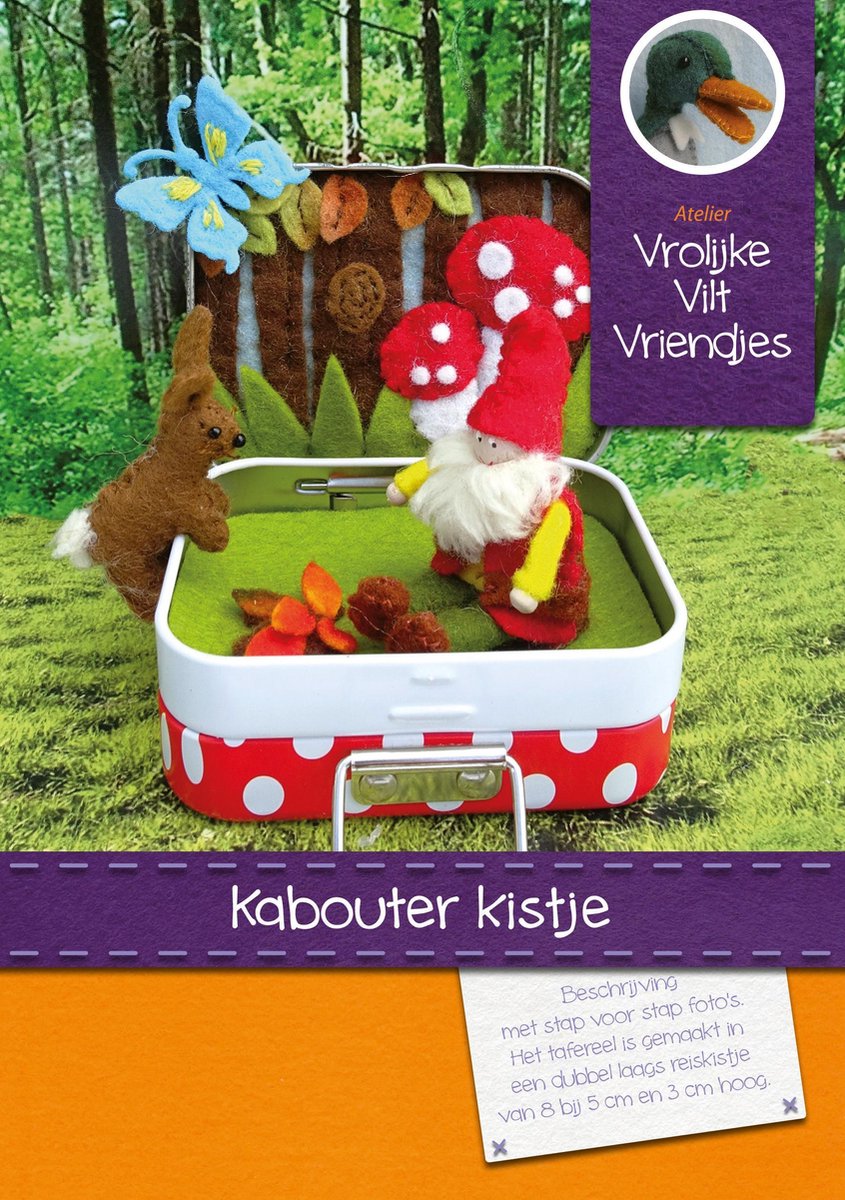Pakket voor het maken van een kabouter miniatuur kistje. Hiervoor wordt een dubbellaags metalen reiskistje gebruikt. Onderin het kistje is een slaapplaats voor de kabouter. Bovenin het kistje is een bostafereel met een konijntje en vlinder. De kabouter kan in verschillende houdingen worden neergezet. Het konijntje kan ook aan de rand van het kistje hangen. Het kistje is 8 cm lang, 5 cm breed en 3 cm hoog.