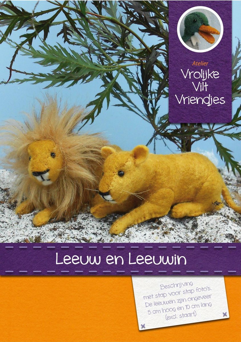 Compleet pakket voor het maken van een leeuw en leeuwin. De leeuw heeft prachtige manen van een prachtige stof. De leeuwen zijn 5 bij 10 cm (excl. staart) groot. Een beschrijving en stap- voor stap foto's.