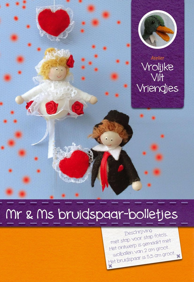 Pakket voor het maken van een bruidspaar aan de hand van stap- voor stap foto's. De popjes worden gemaakt op wolballen van 2 cm groot. De gezichtjes zijn handgeverfd op houten kralen. In het pakket zit 100% wolvilt, kant met organzalint en mooie kanten rozetten. De popjes zijn ongeveer 6 cm groot en gemaakt met 100% wolvilt. Leuk als bedankje, op een kaart of met een enveloppe, of op een bruidstaart.