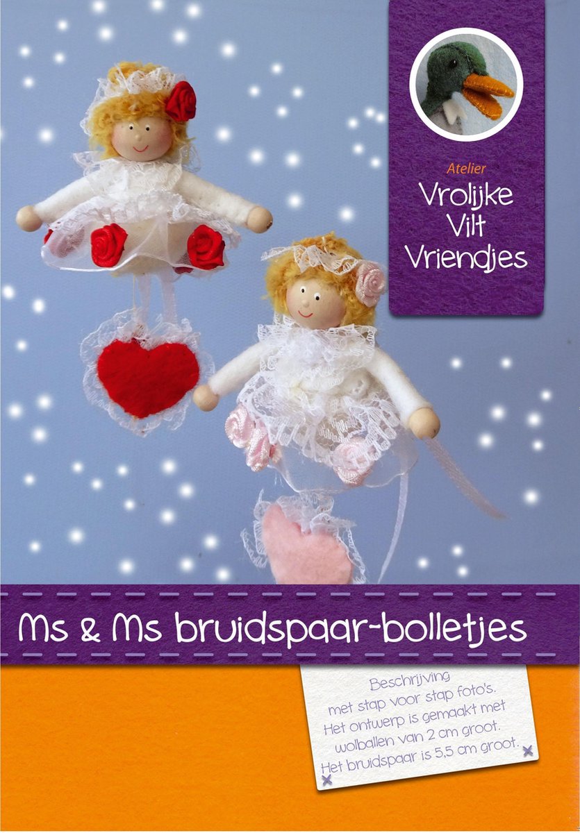 Pakket voor het maken van een bruidspaar aan de hand van stap- voor stap foto's. De popjes worden gemaakt op wolballen van 2 cm groot. De gezichtjes zijn handgeverfd op houten kralen. In het pakket zit 100% wolvilt, kant met organzalint en mooie kanten rozetten. De popjes zijn ongeveer 6 cm groot en gemaakt met 100% wolvilt. Leuk als bedankje, op een kaart of met een enveloppe, of op een bruidstaart
