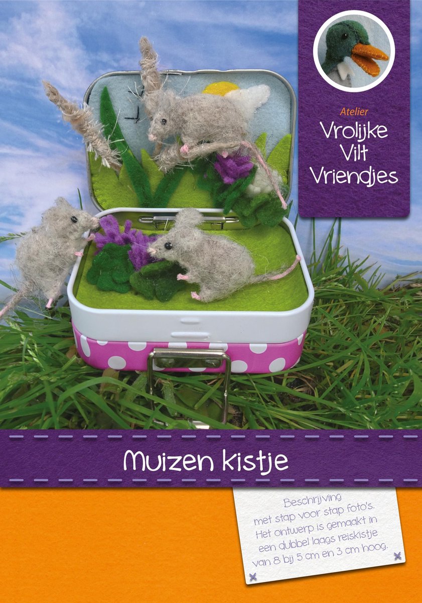 Pakket voor het maken van een muizen miniatuur kistje van 8l en 5b en 3h cm Hiervoor wordt een dubbellaags metalen reiskistje gebruikt Onderin het kunnen de 3 kleine muisjes heerlijk slapen. In het pakket beschrijving met stap- voor stap foto's en 100% wolvilt.