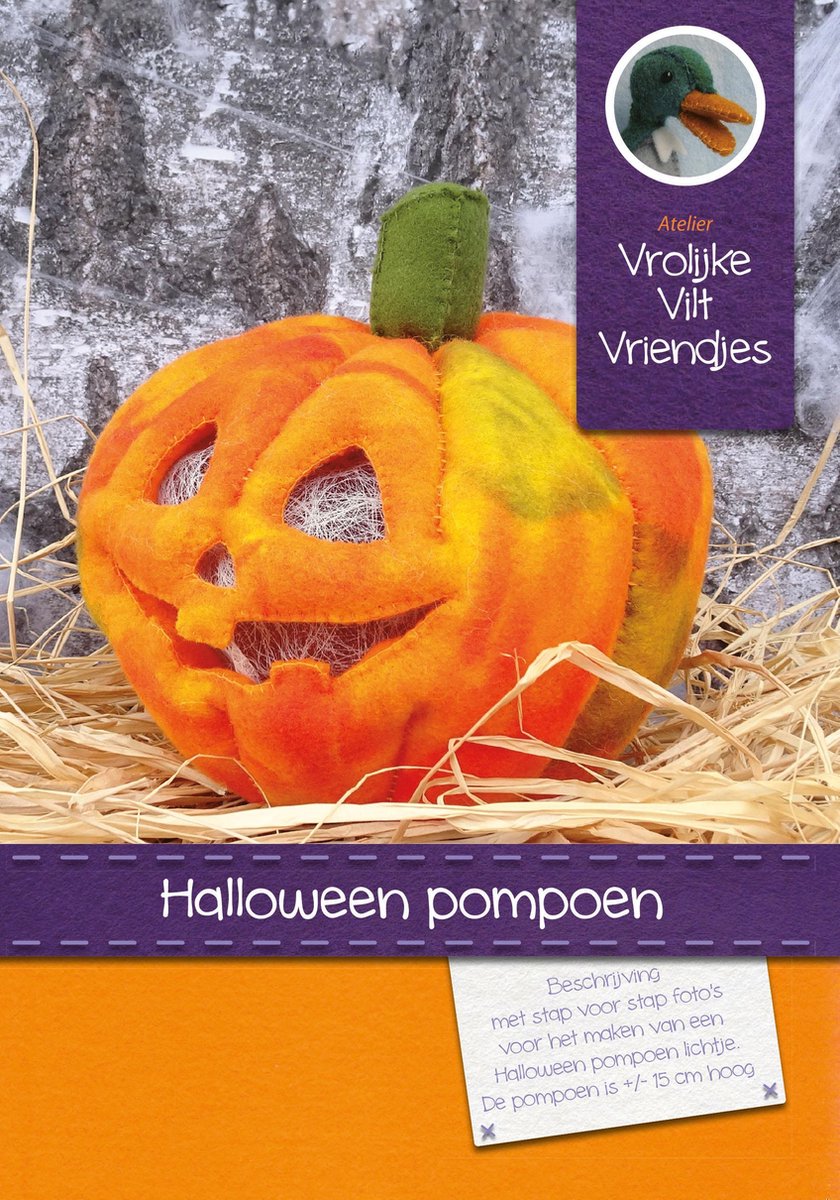 Pakket met stap voor stap foto's voor het maken van een pompoen van ongeveer 15 bij 18 cm. De buitenkant van de pompoen is gemaakt van 100% sprookjeswolvilt, hand geverfd.
