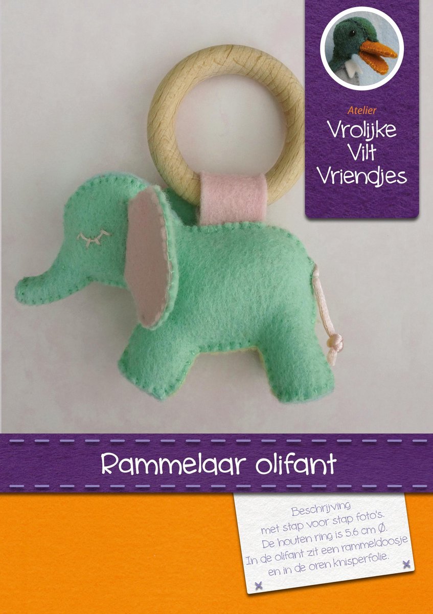 Pakket voor het maken van een rammelaar in pasteltinten. In de oren zit knisperfolie en in het buikje een rammelblokje. De beuken houten ring is 5.6 cm doorsnee.