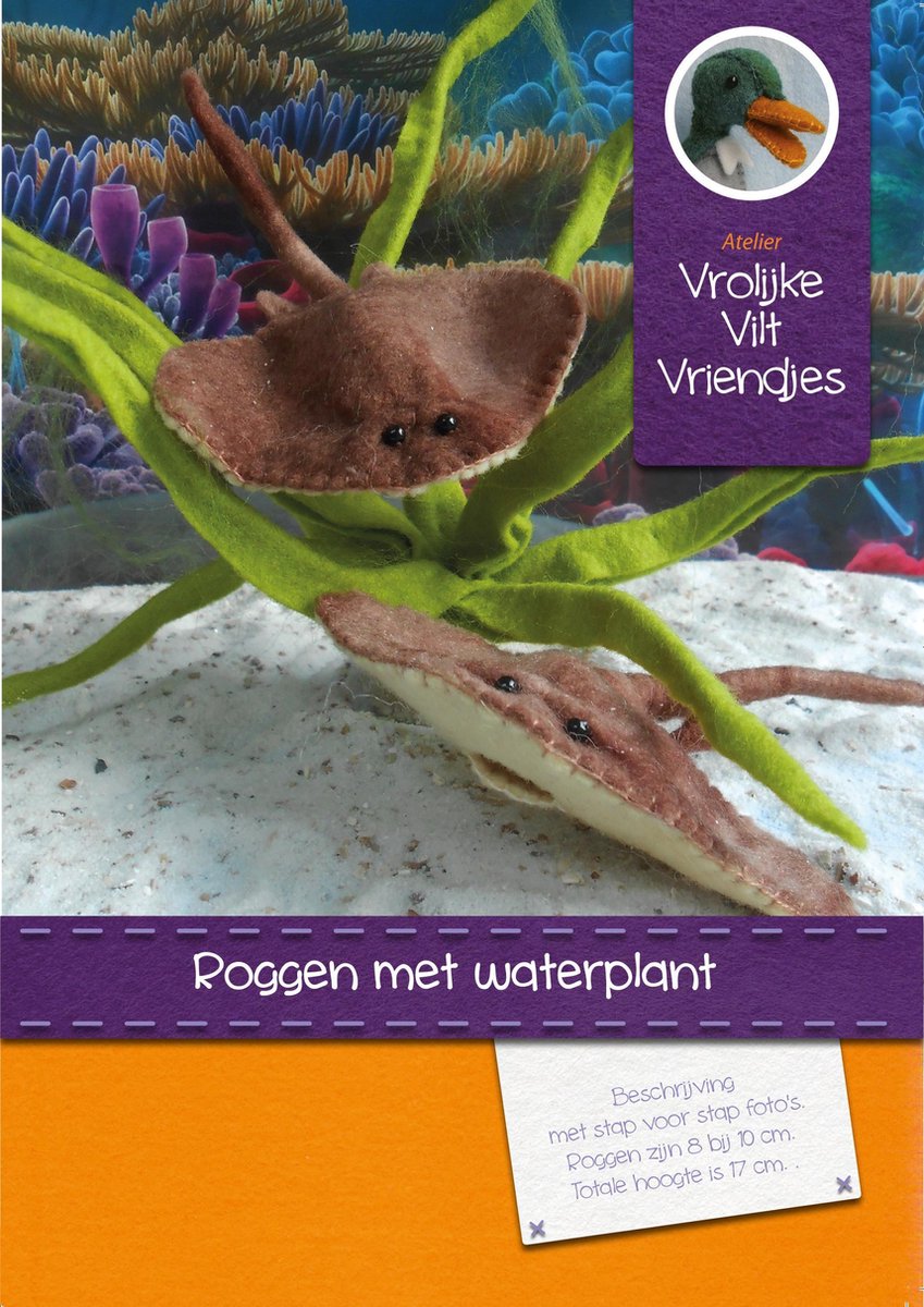 Diy pakket voor het maken van 2 roggen en een waterplant. De roggen worden gemaakt uit sprookjesvilt en zijn 8 bij 10 cm groot. De waterplant is ongeveer 17 cm hoog.Compleet pakket met stap- voor stap foto's en duidelijke beschrijving.