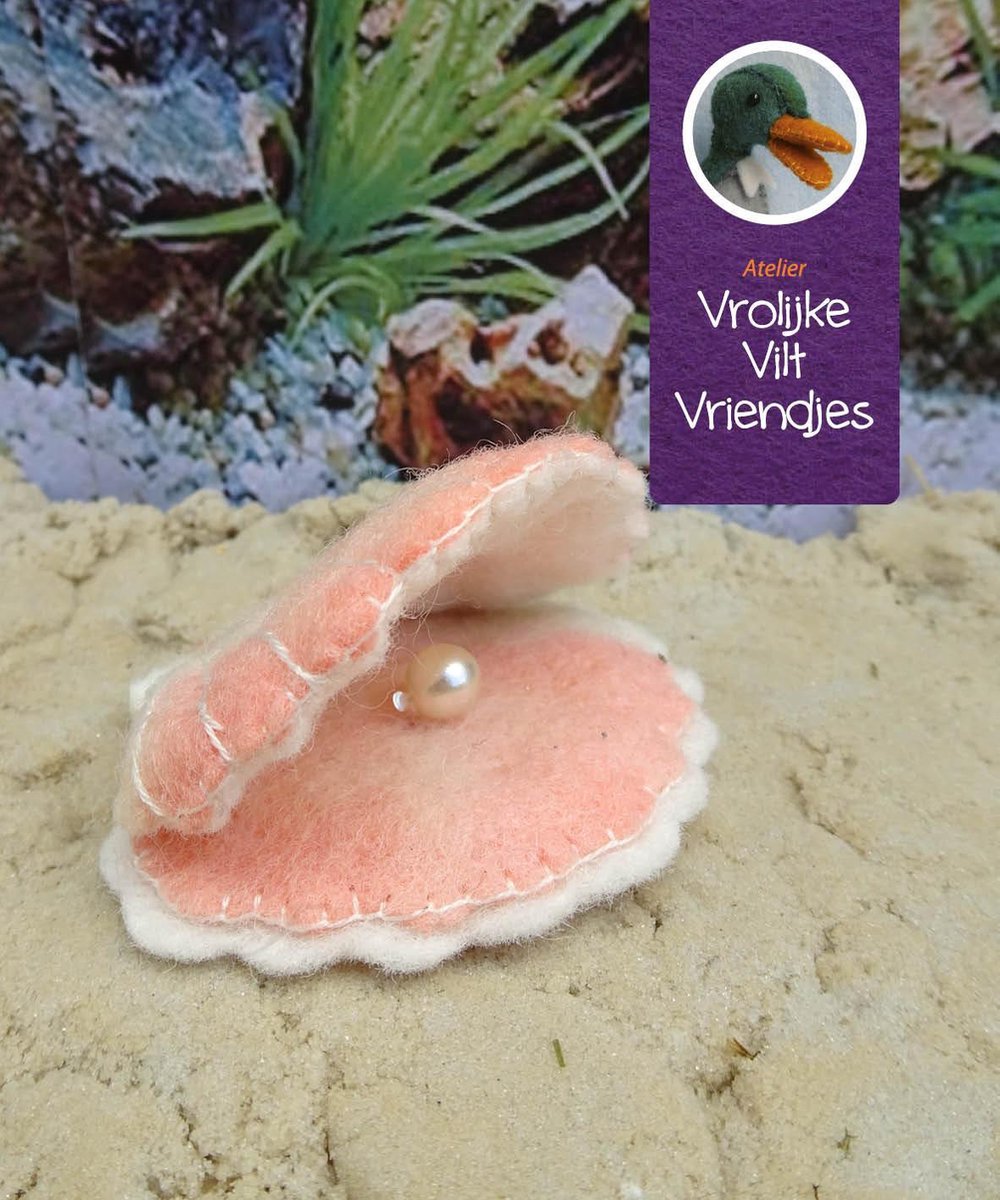 Een grote schelp van 5 bij 6 cm. In de schelp zit een parelkraal. De drie kleine scheplen zijn 3 bij 3.5 cm groot. In het pakket zitten alle materialen met sprookjeswolvilt. Het bevat een beschrijving met stap voor stap foto's.