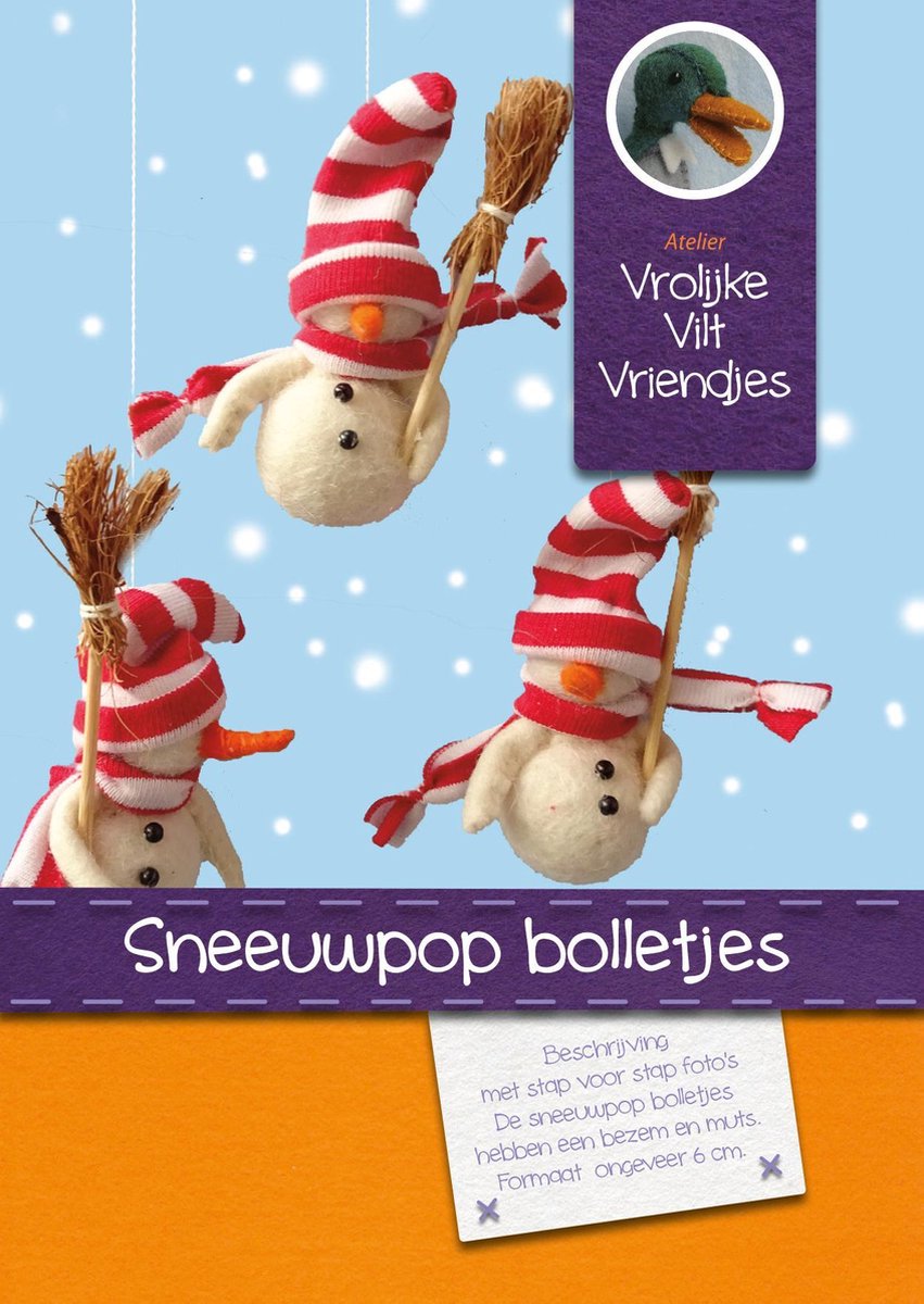 DIY pakket voor het maken van 3 sneeuwpop bolletjes uit 100% wolvilt. De mutsjes en sjaal worden gemaakt uit gestreept tricot. De bezems worden gemaakt uit prikkers en kokostouw. De wolballen zijn 2 cm en 1.5 cm groot.