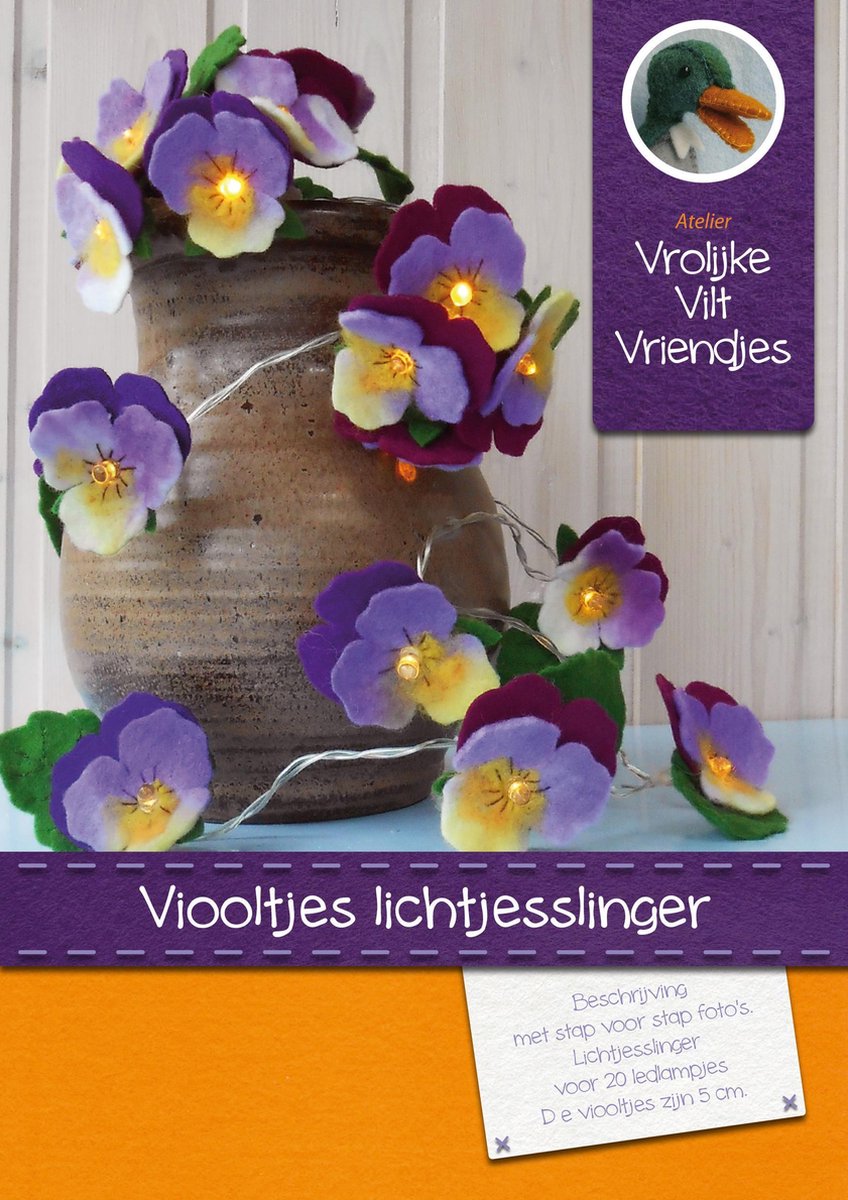 Compleet pakket voor het maken van een viooltjes lichtjesslinger met 20 lampjes. De beschrijving is voorzien van stap- voor stap foto's met duidelijke beschrijving. De viooltjes worden gemaakt uit prachtig handgeverfd sprookjesvilt. Het hart van het viooltje wordt met wolvlies in het vilt geprikt, voor een natuurlijke uitstraling.