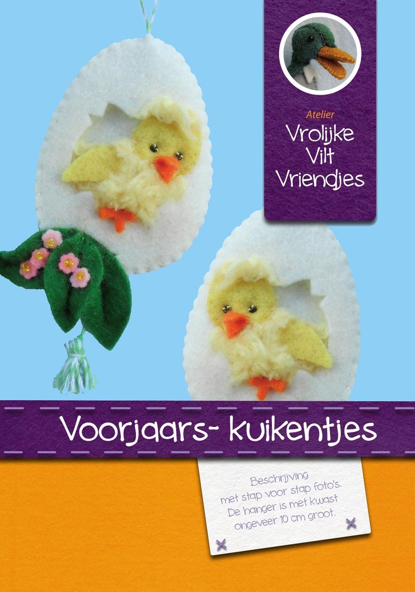 DIY pakket voor het maken van 2 eieren met kuikentjes. De beschrijving is voorzien van stap- voor stap foto's. In het pakket zit al het materiaal om deze vrolijke hangers te kunnen maken. De materialen zijn 100% wolvilt en zachte teddystof.