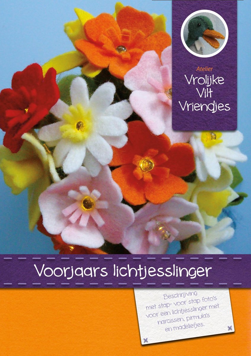 Compleet pakket voorjaarsbloemen met lampjesslinger 20 lampjes, Narcis, Primula en Madelief. De bloemen zijn gemaakt uit 100% wolvilt en sprookjeswolvilt. Met 20 ledlampjes.