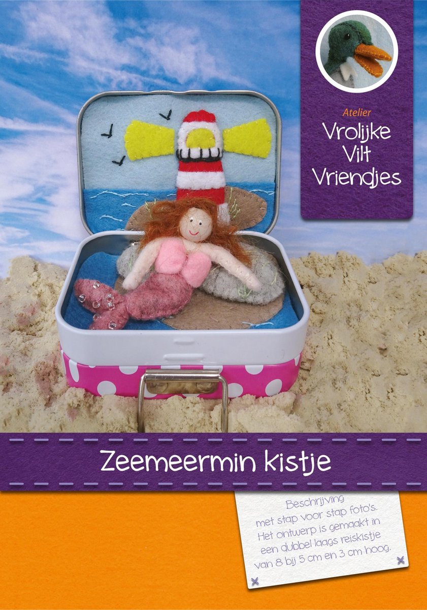 Pakket voor het maken van een zeemeermin kistje. Hiervoor wordt een dubbellaags metalen reiskistje gebruikt. Het reiskistje is 8 cm lang, 5 cm breed en 3 cm hoog.
