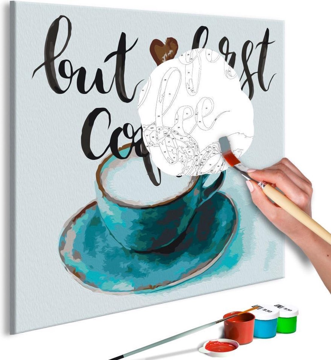Ontwaak uw creativiteit Wilt u creatief ontspannen? Op zoek naar een origineel avontuur, waar u ook uw dierbaren kunt uitnodigen? Tegelijkertijd wordt u wakker van uw creativiteit en voelt u zich een echte kunstenaar. Niets is makkelijker ! Ontdek de meest originele hobby van dit jaar - schilderen op nummers. Een kleurrijke schilderij kit door nummers But First Coffee is een ongebruikelijk idee voor het besteden van vrije tijd. Schilderij kit door nummers But First Coffee is een activiteit voor mensen van alle leeftijden. Perfect voor amateur schilders! Dit schilderij zal perfect zijn als wandversiering. We presenteren een complete schilderkit voor volwassenen en ambitieuze kinderen ouder dan 12 jaar. De set bevat: * Schemapatroonmet gekleurde velden - om uw kinderen te helpen schilderen * 2 borstels met verschillende borsteldiktes * Een set acrylverf in containers, speciaal geselecteerd voor het door u gekozen patroon. * Diagram patroon met gekleurde velden - om u te helpen met