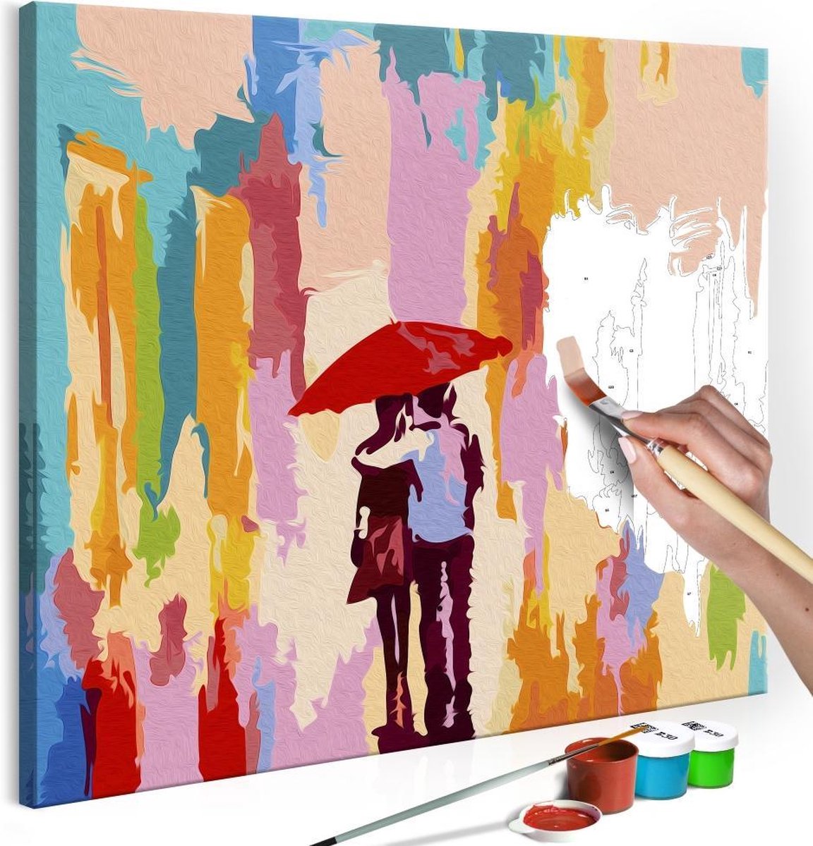 Ontwaak uw creativiteit Wilt u creatief ontspannen? Op zoek naar een origineel avontuur, waar u ook uw dierbaren kunt uitnodigen? Tegelijkertijd wordt u wakker van uw creativiteit en voelt u zich een echte kunstenaar. Niets is makkelijker ! Ontdek de meest originele hobby van dit jaar - schilderen op nummers. Een kleurrijke schilderij kit door nummers Echtpaar onder paraplu is een ongebruikelijk idee voor het besteden van vrije tijd. Schilderij kit door nummers Echtpaar onder paraplu is een activiteit voor mensen van alle leeftijden. Perfect voor amateur schilders! Dit schilderij zal perfect zijn als wandversiering. We presenteren een complete schilderkit voor volwassenen en ambitieuze kinderen ouder dan 12 jaar. De set bevat: * Schemapatroonmet gekleurde velden - om uw kinderen te helpen schilderen * 2 borstels met verschillende borsteldiktes * Een set acrylverf in containers, speciaal geselecteerd voor het door u gekozen patroon. * Diagram patroon met gekleurde velden - om u te