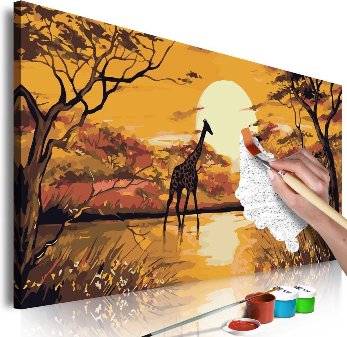 Ontwaak uw creativiteit Wilt u creatief ontspannen? Op zoek naar een origineel avontuur, waar u ook uw dierbaren kunt uitnodigen? Tegelijkertijd wordt u wakker van uw creativiteit en voelt u zich een echte kunstenaar. Niets is makkelijker ! Ontdek de meest originele hobby van dit jaar - schilderen op nummers. Een kleurrijke schilderij kit door nummers Giraf bij Zonsondergang is een ongebruikelijk idee voor het besteden van vrije tijd. Schilderij kit door nummers Giraf bij Zonsondergang is een activiteit voor mensen van alle leeftijden. Perfect voor amateur schilders! Dit schilderij zal perfect zijn als wandversiering. We presenteren een complete schilderkit voor volwassenen en ambitieuze kinderen ouder dan 12 jaar. De set bevat: * Schemapatroonmet gekleurde velden - om uw kinderen te helpen schilderen * 2 borstels met verschillende borsteldiktes * Een set acrylverf in containers, speciaal geselecteerd voor het door u gekozen patroon. * Diagram patroon met gekleurde velden - om u te