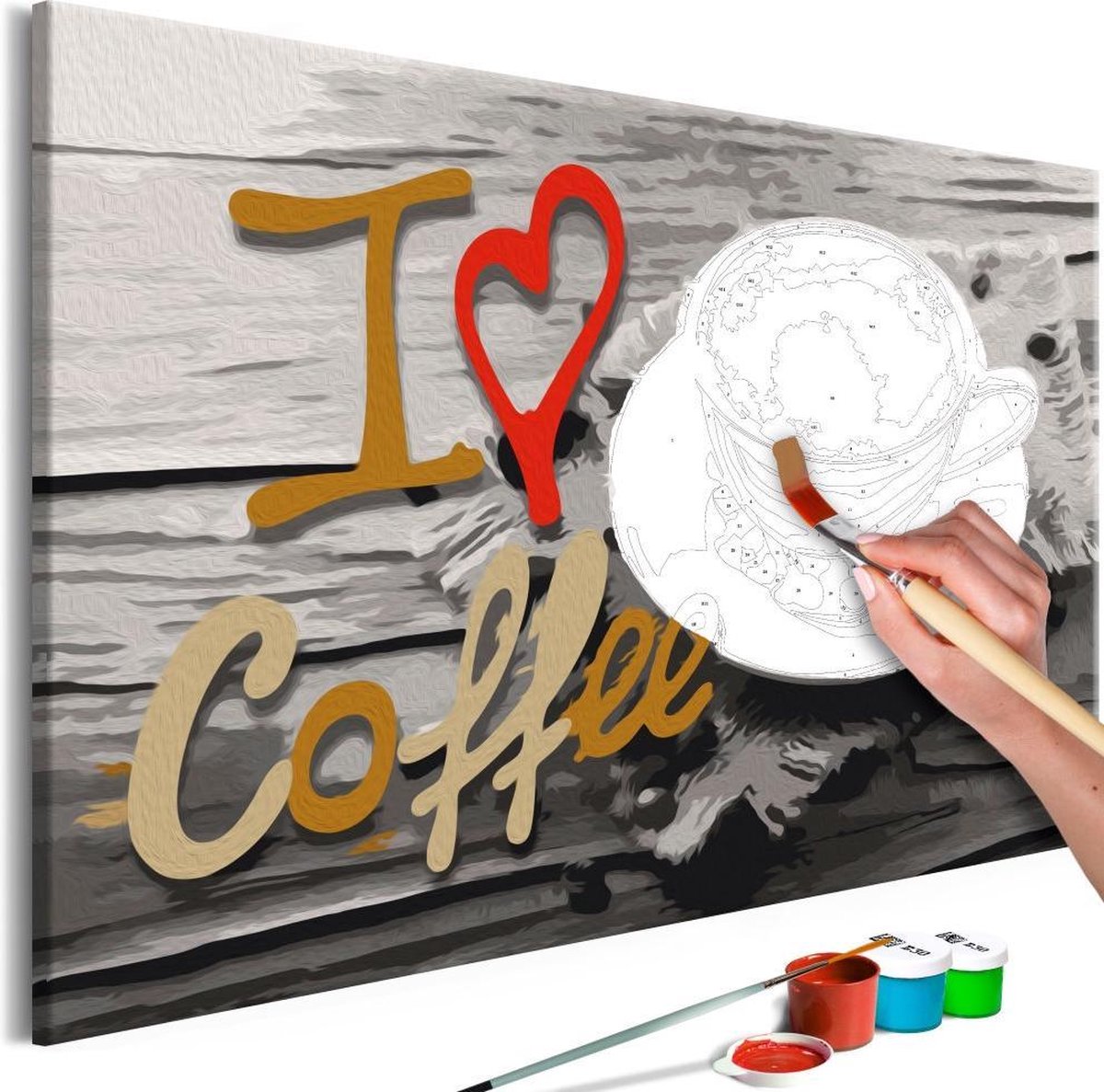 Ontwaak uw creativiteit Wilt u creatief ontspannen? Op zoek naar een origineel avontuur, waar u ook uw dierbaren kunt uitnodigen? Tegelijkertijd wordt u wakker van uw creativiteit en voelt u zich een echte kunstenaar. Niets is makkelijker ! Ontdek de meest originele hobby van dit jaar - schilderen op nummers. Een kleurrijke schilderij kit door nummers I Love Coffee is een ongebruikelijk idee voor het besteden van vrije tijd. Schilderij kit door nummers I Love Coffee is een activiteit voor mensen van alle leeftijden. Perfect voor amateur schilders! Dit schilderij zal perfect zijn als wandversiering. We presenteren een complete schilderkit voor volwassenen en ambitieuze kinderen ouder dan 12 jaar. De set bevat: * Schemapatroonmet gekleurde velden - om uw kinderen te helpen schilderen * 2 borstels met verschillende borsteldiktes * Een set acrylverf in containers, speciaal geselecteerd voor het door u gekozen patroon. * Diagram patroon met gekleurde velden - om u te helpen met schilderen