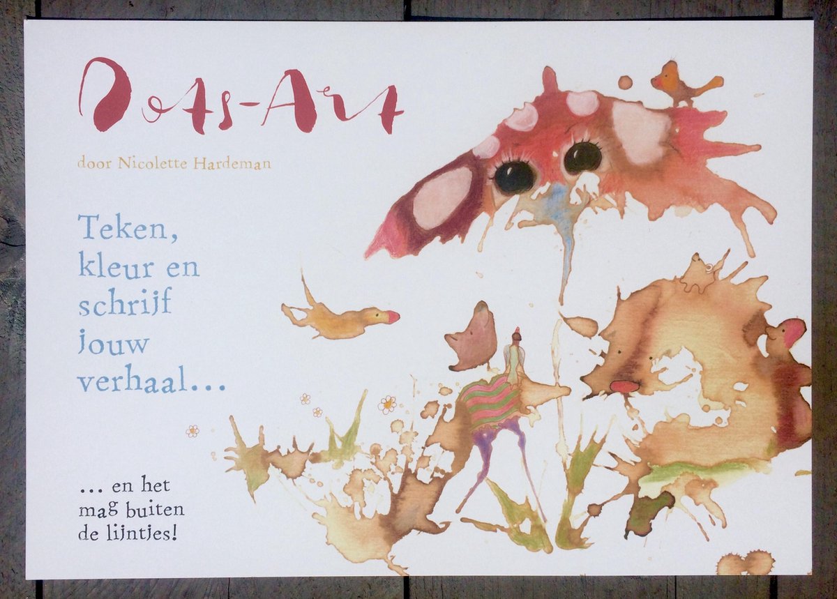 Teken, kleur en schrijf jouw verhaal... en het mag buiten de lijntjes. Dots-art is voor jong en oud, om samen te doen of alleen. Het zet je aan om in verbinding te gaan met jezelf of samen met anderen. Wat jij er in ziet, daar gaat het om! Ervaar wat het (in)kleuren en (in)tekenen van deze Dots met je doet: draai de kleurplaten en laat je inspireren door de vormen tot je hét ziet! Hoe je dat kan doen, bekijk hier: https://youtu.be/ge4f8hwRp68. Dots-art is een prentenboek dat bestaat uit 12 grote A3 bedrukte losse kleurplaten en 12 blanco die elke keer een ander verhaal in zich dragen. Het speciale papier is uitermate geschikt om er met verschillende materialen op te werken: waterverf, lijm, glitters, plak-ogen, fineliners, kantjes, stofjes... Door de creatieve ontdekkingstocht kan je brein loskomen van dagelijkse routines. Het maken van jouw verhaal brengt je onbewuste gedachtes tot uiting, brengt ontspanning en traint je oplossingsvermogen. Deze therapeutische effecten kan je dus nu