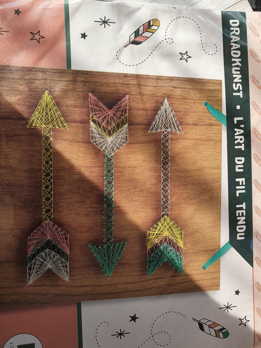 Draadkunst / stringart Door het weven van draad tussen spijkertjes krijg kun je leuke schilderijtjes maken. In verpakking 1x foambord met patroon 5x draad verschillende kleuren 1x lint 1x patroon 1x setje spelden 1x instructies