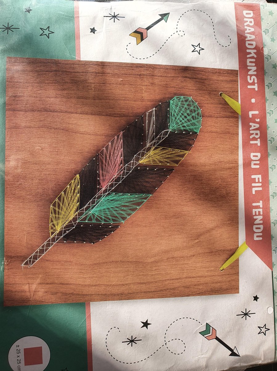 Draadkunst / stringart Door het weven van draad tussen spijkertjes krijg kun je leuke schilderijtjes maken. In verpakking 1x foambord met patroon 5x draad verschillende kleuren 1x lint 1x patroon 1x setje spelden 1x instructies