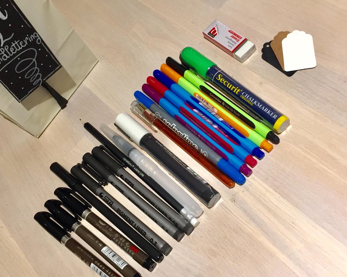 Wil je beginnen met handletteren? Ben je op zoek naar een starterset? Of op zoek naar een leuk cadeautje voor iemand die graag tekent of handletterd Wij stellen speciaal voor jou een basisset aan, waarmee je kan experimenteren met diverse verschillende soorten stiften en pennen en zo je favoriete stiften kan ontdekken. Deze complete set bevat 19 stiften/pennen, 1 potlood, 1 gom , 3 labels. De kleuren kunnen verschillen in elk pakket. 3 japanse kalligrafiestiften zwart ( in 3 verschillende penpunten) 1 waterbrush 3 zwarte fineliners (in verschillende diktes) 1 hybrid dual metallic pen 1 rechte kalligrafiestift 1 gekleurde krijtstift 1 posca permanent marker 2 gekleurde fineliners 3 gekleurde rollerpennen 1 gekleurde duostift 1 potlood 1 gom 3 labels