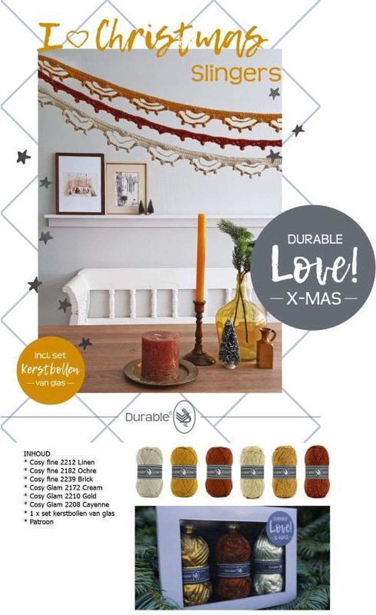 Durable I ? X-mas Slingers (pkt)* Inhoud pakket; 010.66 Durable Glam: kleur 2208 Cayenne 1 bol kleur 2210 Gold 1 bol kleur 2172 Cream 1 bol 010.67 Durable Cosy Fine: kleur 2239 Brick 1 bol kleur 2212 Linen 1 bol kleur 2182 Ochre 1 bol