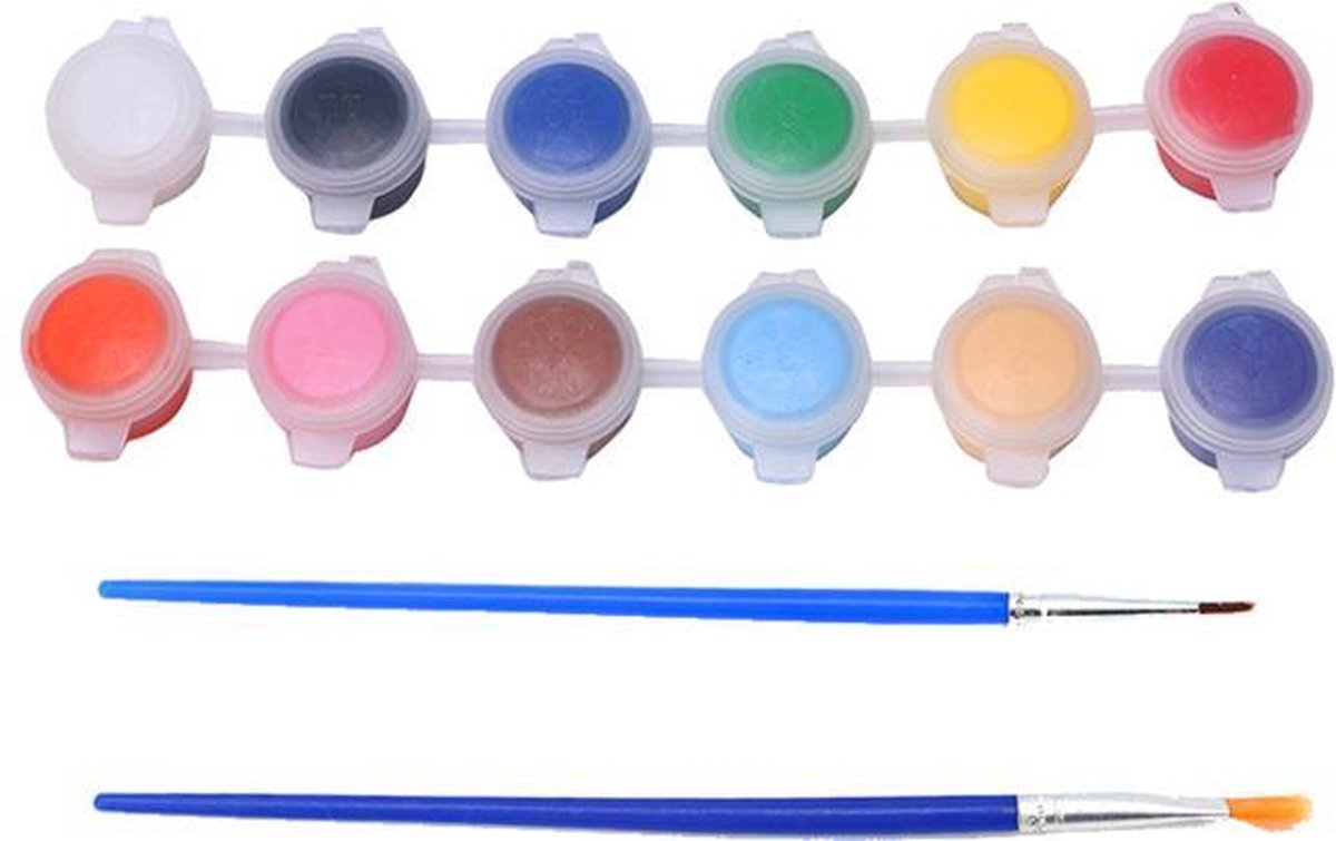 •Pigment acrylverf •Niet-giftig, onschadelijk, niet-radioactieve, sterke milieu absorptiecapaciteit •Niet-brandbaar, niet-vluchtig. Geen speciale opslag eisen •Onschadelijk voor de menselijke huid •Schilderen op: leer, kleding, papier, hout, glas etc. Kleuren: Zoals op de foto toont (12 kleuren / set) Capaciteit: 3g / potje Inbegrepen •1x 12 potjes (12 kleuren) •1x smal penseel •1x breed penseel