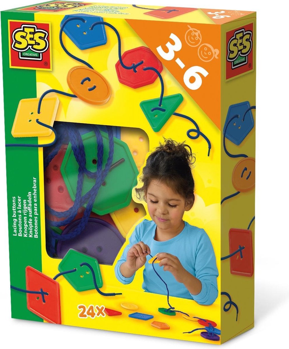 SES creative knopen rijgen Knopen rijgen kan best lastig zijn. Met deze grote knopen en gekleurde veters kun je rustig oefenen. Steek de veters door de gaten van de knopen en maak verschillende rijgsteken. Erg goed voor het ontwikkelen van je fijne motoriek en natuurlijk heb jij straks een prachtige knopenketting! Specificaties: Geslacht: junior Materiaal: kunststof Kleur: multicolor Leeftijd: 3 tot 6 jaar Inhoud: 24 Figuurtjes 4 Veters