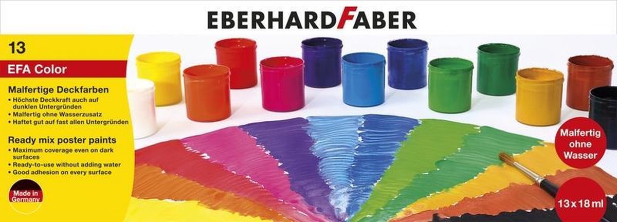 De Verf heeft een erg hoge dekking zelfs op donkere ondergronden. Zeer geschikt als schoolverf. De Verf is kant en klaar, je hoeft dus geen water toe te voegen. De kleuren zijn goed mengbaar met elkaar, dus je kunt met 13 kleuren elke kleur snel en gemakkelijk mengen. De kleur wit is bijzonder goed geschikt om andere kleuren lichter te maken. 13 potjes van 18ml..