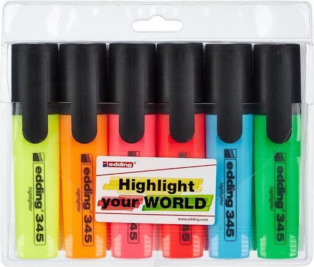 •Highlighter met beitelvormige punt •Wateroplosbare inkt met hoge kleurglans •Schrijfdikte: 2 of 5mm •Assorti van 6 stuks