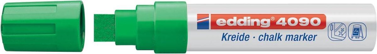 •Download gratis raamtekensjablonen op edding.com/raamtekensjablonen •Geurneutrale vloeibare krijt op waterbasis •Met vochtige doek eenvoudig te verwijderen •Extra brede schrijfdikte •Eenvoudig gebruik – in tegenstelling tot standaard krijt worden uw handen niet vies •Zorgt voor professionelere en elegantere schrijfletters of tekeningen dan elk ander krijt •Breed assortiment aan briljante kleuren – de fluorescerende kleuren worden bovendien zichtbaar onder UV-licht •Dop kan op de achterkant van de barrel worden vastgezet, zodat hij niet kwijtraakt •Verzegelingsfolie garandeert dat het product bij aankoop ongebruikt is •Breed kleurenpalet •Hoogwaardig merkproduct •Made in Germany