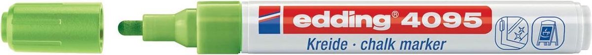 edding-4095 kalk / window marker lichtgroen 1Stuks •Geurneutrale vloeibare krijt op waterbasis •Met vochtige doek eenvoudig te verwijderen •Download gratis raamtekensjablonen op edding.com/raamtekensjablonen •De ronde punt heeft een schrijfdikte van 2-3 mm •Het dekkende, geurneutrale vloeibare krijt op waterbasis is vochtig afwisbaar van bijna alle gesloten oppervlakken •Zorgt voor professionelere en elegantere schrijfletters of tekeningen dan elk ander krijt •Verkrijgbaar in de kleuren zwart, rood, blauw, groen, lichtgroen, wit, neongeel, neonoranje en neonroze •Dop kan op de achterkant van de barrel worden vastgezet, zodat hij niet kwijtraakt •Verzegelingsfolie garandeert dat het product bij aankoop ongebruikt is •Hoogwaardig merkproduct •Made in Germany