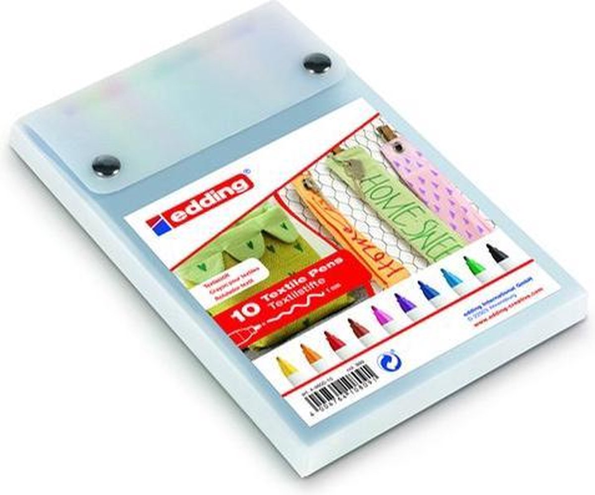 •Schrijven, signeren, fijne motieven en mooie versieringen aanbrengen - creatief bezig zijn met textiel is met de edding 4600 textielpen heel eenvoudig •De edding 4600 is door zijn dunner punt ideaal voor het fijnere werk •Om kledingstukken en ander textiel tot 60 °C wasecht te maken, moet u de stof slechts een keer zonder stoom strijken •De watervaste inkt loopt niet uit bij het aanbrengen, droogt zeer snel en is uiterst lichtbestendig •Ronde punt •In water oplosbare pigmentinkt •Schrijfbreedte: 1 mm •Assorti van 10 stuks (zwart, rood, blauw, groen, geel, oranje, bruin, violet, rose, lichtblauw)