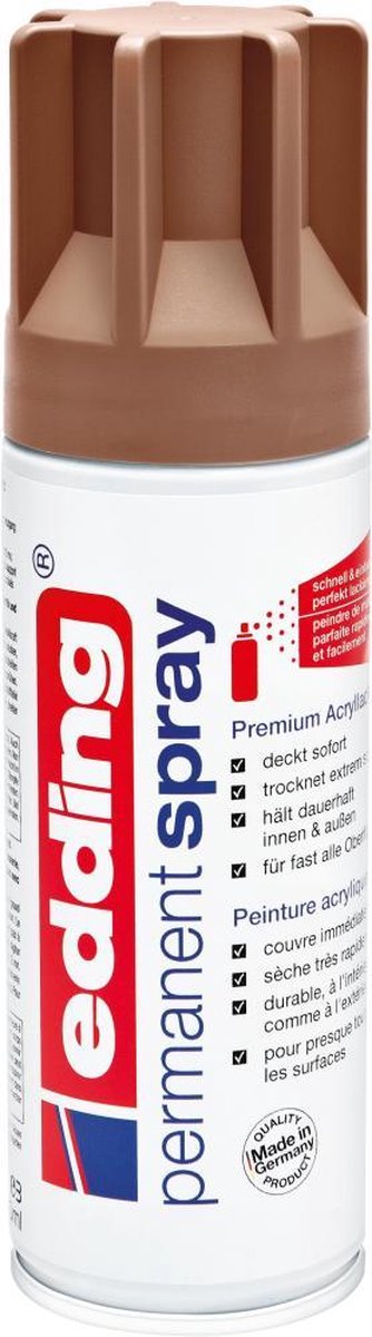 Permanent spuitbus zijdemat acryllak van edding Deze spuitlakken vallen op door de uitzonderlijke hoge dekking, de lakken drogen extreem snel en duurzaam - zowel binnen als buiten. Afhankelijk van de kleur zijn de lakken van edding tweemaal zo royaal als traditionele spuitlakken. Met verwisselbare spuitkoppen kan je diverse spuitbreedten instellen dankzij een nieuwe ventieltechniek. Er zijn 30 intense standaard- en modekleuren in handige spuitbussen van 200 ml. De spuitbussen zijn 100% vrij van zware metalen die de gezondheid kunen schaden. *De droogtijd hangt af van de omgevingstemperatuur, luchtvochtigheid en de dikte van de opgebrachte laag. Voordelen van edding acryllak spuitbus: dekt in één keer, eenmaal spuiten en direct perfect resultaat droogt extreem snel duurzame hechting, binnen & buiten voor vrijwel alle oppervlakken 200 ml spuitbus is geschikt voor 0,7 - 1 m 2