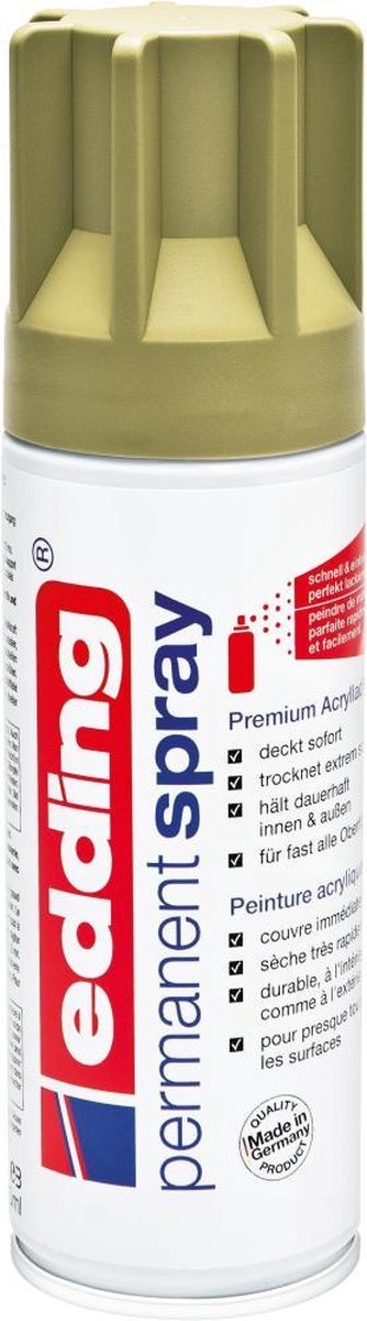 Permanent spuitbus zijdemat acryllak van edding Deze spuitlakken vallen op door de uitzonderlijke hoge dekking, de lakken drogen extreem snel en duurzaam - zowel binnen als buiten. Afhankelijk van de kleur zijn de lakken van edding tweemaal zo royaal als traditionele spuitlakken. Met verwisselbare spuitkoppen kan je diverse spuitbreedten instellen dankzij een nieuwe ventieltechniek. Er zijn 30 intense standaard- en modekleuren in handige spuitbussen van 200 ml. De spuitbussen zijn 100% vrij van zware metalen die de gezondheid kunen schaden. *De droogtijd hangt af van de omgevingstemperatuur, luchtvochtigheid en de dikte van de opgebrachte laag. Voordelen van edding acryllak spuitbus: dekt in één keer, eenmaal spuiten en direct perfect resultaat droogt extreem snel duurzame hechting, binnen & buiten voor vrijwel alle oppervlakken 200 ml spuitbus is geschikt voor 0,7 - 1 m 2