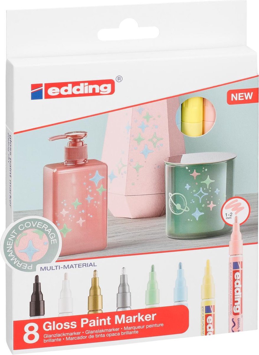 Verfstiften voor dekkend, permanent en veegvast decoreren op materialen, zoals glas, metaal, kunststof en gecoat papier. - De set bevat de kleuren zwart, wit, goud, zilver, pastelgeel, pastelgroen, pastelroze en pastelblauw; - De ronde punt heeft een schrijfdikte van 1-2 mm; - De verfachtige pigmentinkt is sneldrogend, weerbestendig en wrijfvast; - Stiftpunten kunnen vervangen worden; - De inkt is reukarm en zonder toevoeging van tolueen/xyleen; - Hoogwaardige aluminium barrel. Check https://www.edding.com/glossy voor meer informatie over de edding glanslakmarkers.