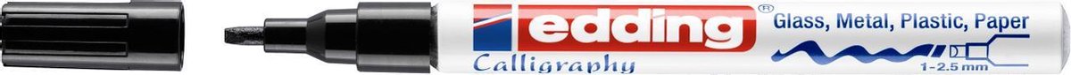Glanslakmarker voor zeer dekkend, permanent en veegvast schrijven en decoreren op gladde en zelfs donkere en transparante materialen, zoals glas, metaal, kunststof en gecoat papier. De kalligrafeerpunt heeft een schrijfdikte van 1-2,5 mm. De verfachtige pigmentinkt is sneldrogend, weerbestendig, extreem lichtbestendig en wrijfvast. Verkrijgbaar in de kleuren zwart, wit, goud, zilver en koper. De inkt is reukarm en zonder toevoeging van tolueen/xyleen. Hoogwaardige aluminium barrel.