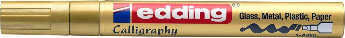 Glanslakmarker voor zeer dekkend, permanent en veegvast schrijven of versieren op gladde – zelfs donkere en transparante – materialen, zoals glas, metaal, kunststof en gecoat papier. De kalligrafeerpunt heeft een schrijfdikte van 1-4 mm. De verfachtige pigmentinkt is sneldrogend, weerbestendig, extreem lichtbestendig en wrijfvast. De inkt is reukarm en zonder toevoeging van tolueen/xyleen. Hoogwaardige aluminium barrel.