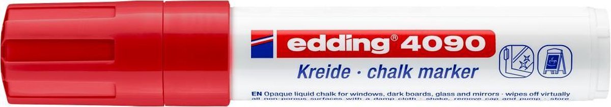 •Extra brede schrijfdikte •Eenvoudig gebruik – in tegenstelling tot standaard krijt worden uw handen niet vies •Zorgt voor professionelere en elegantere schrijfletters of tekeningen dan elk ander krijt •Breed assortiment aan briljante kleuren – de fluorescerende kleuren worden bovendien zichtbaar onder UV-licht •Dop kan op de achterkant van de barrel worden vastgezet, zodat hij niet kwijtraakt •Verzegelingsfolie garandeert dat het product bij aankoop ongebruikt is •Breed kleurenpalet •Hoogwaardig merkproduct •Made in Germany •Download gratis raamtekensjablonen op edding.com/raamtekensjablonen