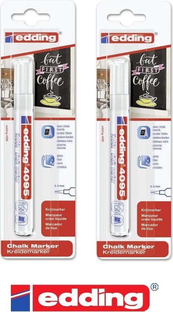 Edding 4095 - Set van 2 De Edding 4095 chalk marker: In deze marker zit dekkende, vloeibare krijt ideaal voor op donker papier, ramen, glas of spiegels. Doordat de marker op water basis is kun je de maker van bijna alle gladde ondergronden makkelijk weer verwijderen door middel van bijvoorbeeld een vochtige doek. U ontvangt 2 chalk markers, apart verpakt.