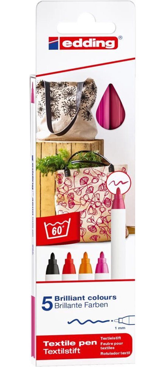 Textielstift voor wasbestendig decoreren en tekenen op de meeste lichte stoffen, zoals katoen, zijde en linnen. De ronde punt heeft een schrijfdikte van 1 mm. De pigmentinkt op waterbasis is geurneutraal, sneldrogend en extreem lichtecht. Na fixeren met het strijkijzer (zonder stoom) is de kleur wasvast tot 60 °C. De verpakking bevat de kleuren zwart, rood, oranje, roze en karmijnrood.