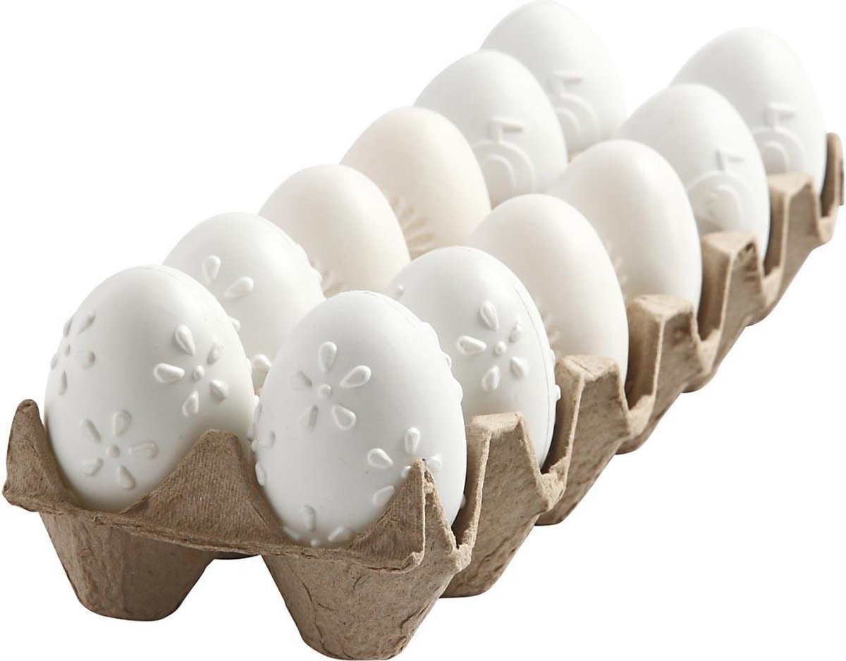 Levensechte plastic eieren met patroon en kalkachtig. Set met 3 verschillende designs, van elk 4 stuks.Levensecht plastic ei met patroon en zijdemat oppervlak en gat aan de bovenkant.