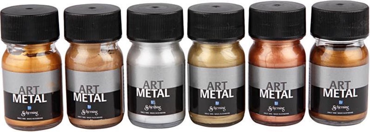 Ondoorzichtige, waterbestendige metaalverf op waterbasis. Het hoge pigmentgehalte geeft een prachtige glanzende uitstraling. De set bevat 6 kleuren van 30 ml in de kleuren: Licht goud, medium goud, donker goud, antiek goud, zilver en koper.