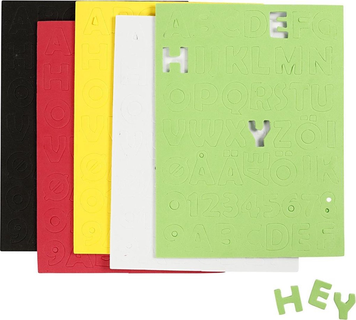 Zelfklevende letters en cijfers (51 stuks) van een zacht, foamachtig materiaal dat gemakkelijk te knippen en te ponsen is.Zelfklevende letters en cijfers (51 stuks) van een zacht, foamachtig materiaal dat gemakkelijk te knippen en te ponsen is.
