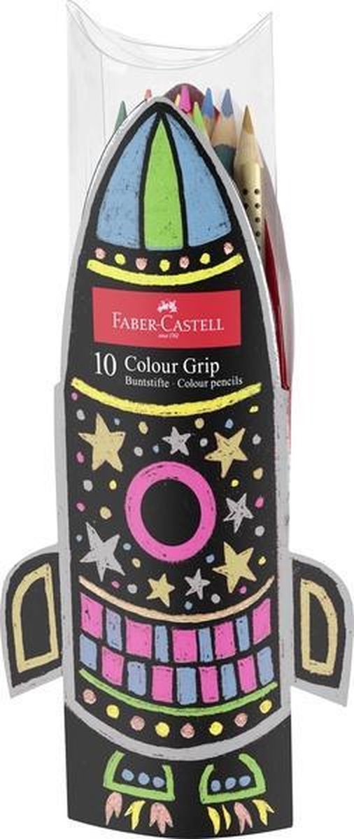 Kleurpotlood in ergonomische driehoekige vorm met gepatenteerde Soft-Grip-zone. Stift bevat zeer lichte pigmenten en is wateroplosbaar. Driehoekige vorm bevordert de drie punt grip. Geschikt voor rechts- of linkshandige kinderen. Breukvast vanwege speciale belijming. Kan uit de meeste stoffen worden gewassen. Eenvoudig te slijpen met een kwaliteit slijper. Inhoud: 5x Grip neon kleurpotloden en 5x Grip metallic kleurpotloden.