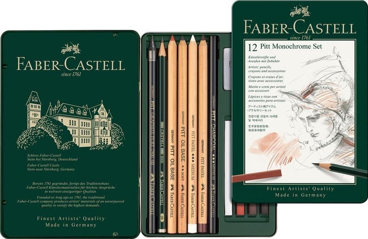 Monochrome set Faber-Castell Pitt. Geselecteerd assortiment bestaande uit houtskool, grafietpotloden, krijt, pastelpotloden en kneedgum. Inhoud: 12-delig. Bliketui.
