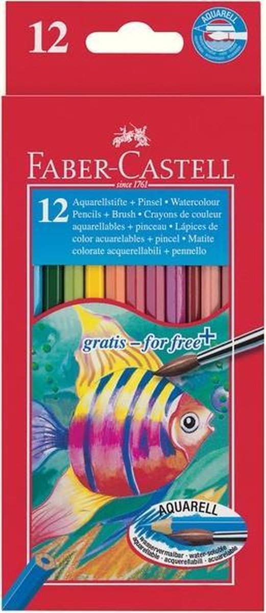 Hexagonale schachtvorm. Kleuren in water mengbaar. Heldere kleuren en een speciale verlijming om breken van de stift te voorkomen. Uitwasbaar. Kartonetui à 12 stuks + penseel.