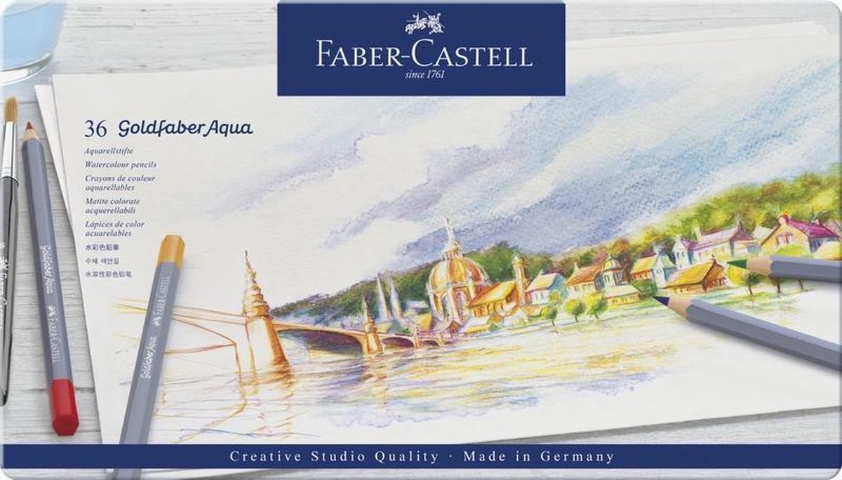 Aquarelpotlood, 3,3 mm breukvaste kern, in hout gevat, hexagonale uitvoering. Volledig met water oplosbaar. Hoogwaardige pigmenten met voortreffelijke kleurkracht en lichtbestendigheid. Verkrijgbaar in 48 kleuren. Houder gelakt in grijze kleur en achterzijde gelakt in de kleur van het potlood. Bliketui 36 stuks. De Goldfaber aqua kleurpotloden bevatten een samenstelling van was met pigmenten, hulp- en vulstoffen, oppervlakte-actieve stoffen en bevatten geen olie.