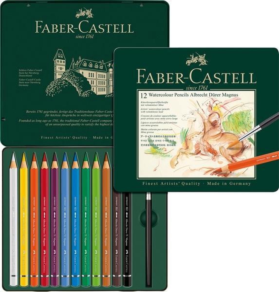Combinatie van kleurpotlood en aquarelverf. Pigmentrijke extra dikke aquarelpotloden in hout gevat met een kerndiameter van 5,3 mm. De kleur is volledig wateroplosbaar. Hoogwaardige pigmenten met hoge lichtbestendigheid en kleurkracht. Onbegrensde mengmogelijkheden bij het aquarelleren. Zeshoekige uitvoering. Houder gelakt in de kleur van het potlood. Metalen etui à 12 stuks.