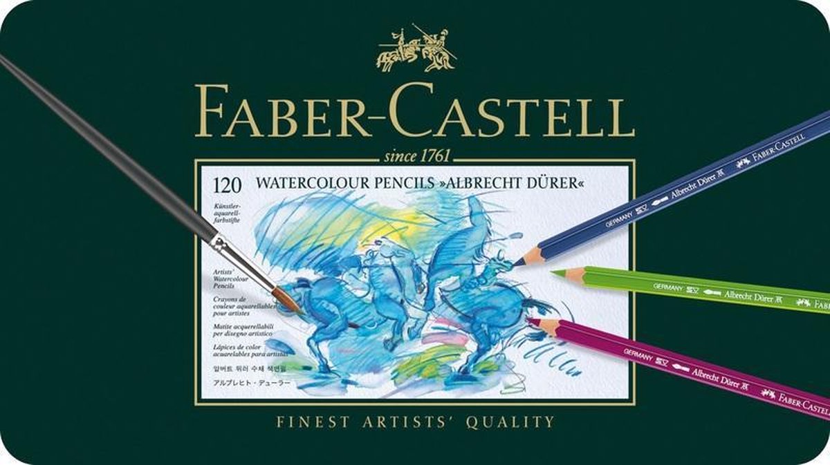 Combinatie van kleurpotlood en aquarelverf. Pigmentrijke aquarelpotloden in hout gevat met een kerndiameter van 3,8 mm. Perfect met water verschilderbaar. Hoogwaardige pigmenten met hoge lichtbestendigheid en kleurkracht. Onbegrensde mengmogelijkheden bij het aquarelleren met 120 kleuren. Zeshoekige uitvoering. Houder gelakt in de kleur van het potlood. Metalen etui à 120 stuks.