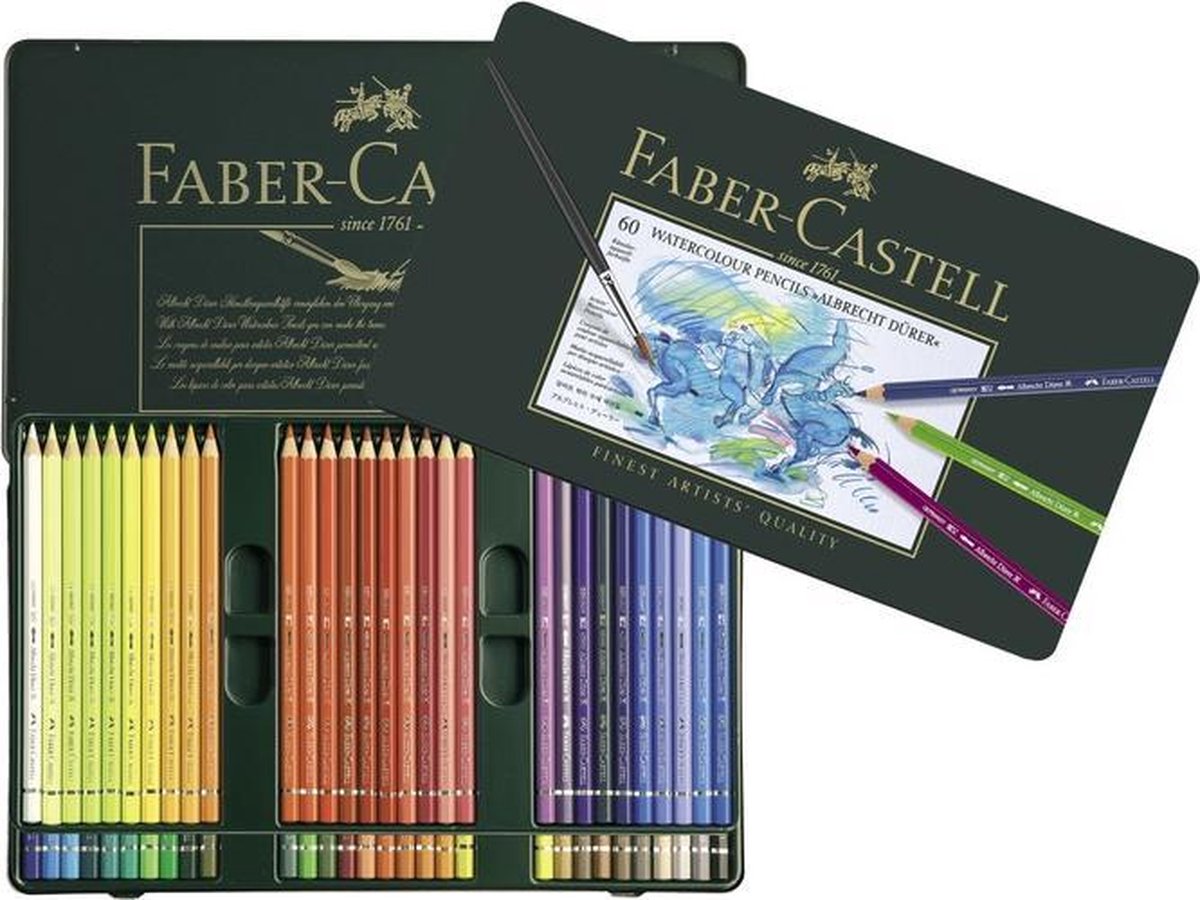 Combinatie van kleurpotlood en aquarelverf. Pigmentrijke aquarelpotloden in hout gevat met een kerndiameter van 3,8 mm. Perfect met water verschilderbaar. Hoogwaardige pigmenten met hoge lichtbestendigheid en kleurkracht. Onbegrensde mengmogelijkheden bij het aquarelleren met 120 kleuren. Zeshoekige uitvoering. Houder gelakt in de kleur van het potlood. Metalen etui à 60 stuks.
