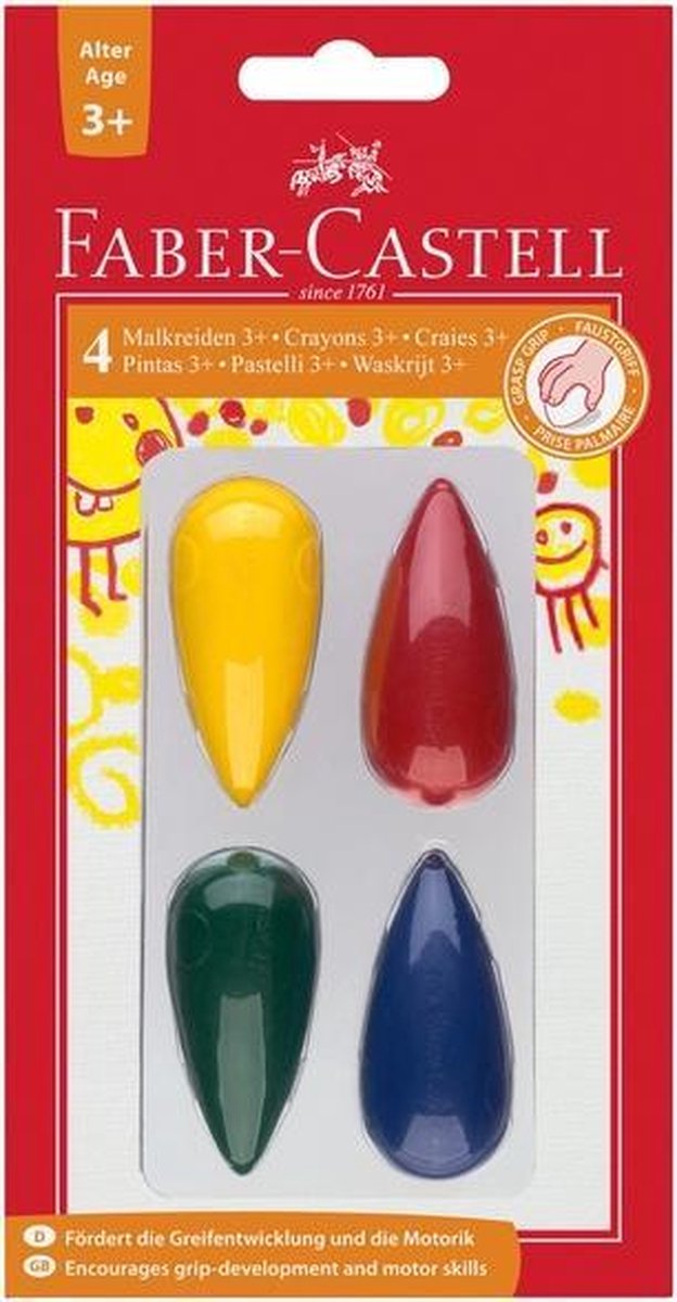 De kleurkrijten zijn door hun druppelvorm uitstekend geschikt voor kinderen vanaf 4 jaar. Ze bevorderen de overgang van de vuistgreep naar het normaal vasthouden van krijt. De heldere kleuren kunnen gemakkelijk verwijderd worden en de handen blijven schoon.