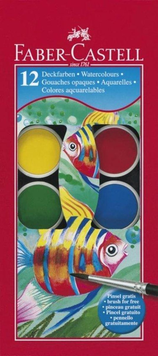 Waterverfdoos. Doos met 12 heldere en intensieve kleuren. Napje van 3 cm diameter. Inclusief penseel. In water oplosbaar.